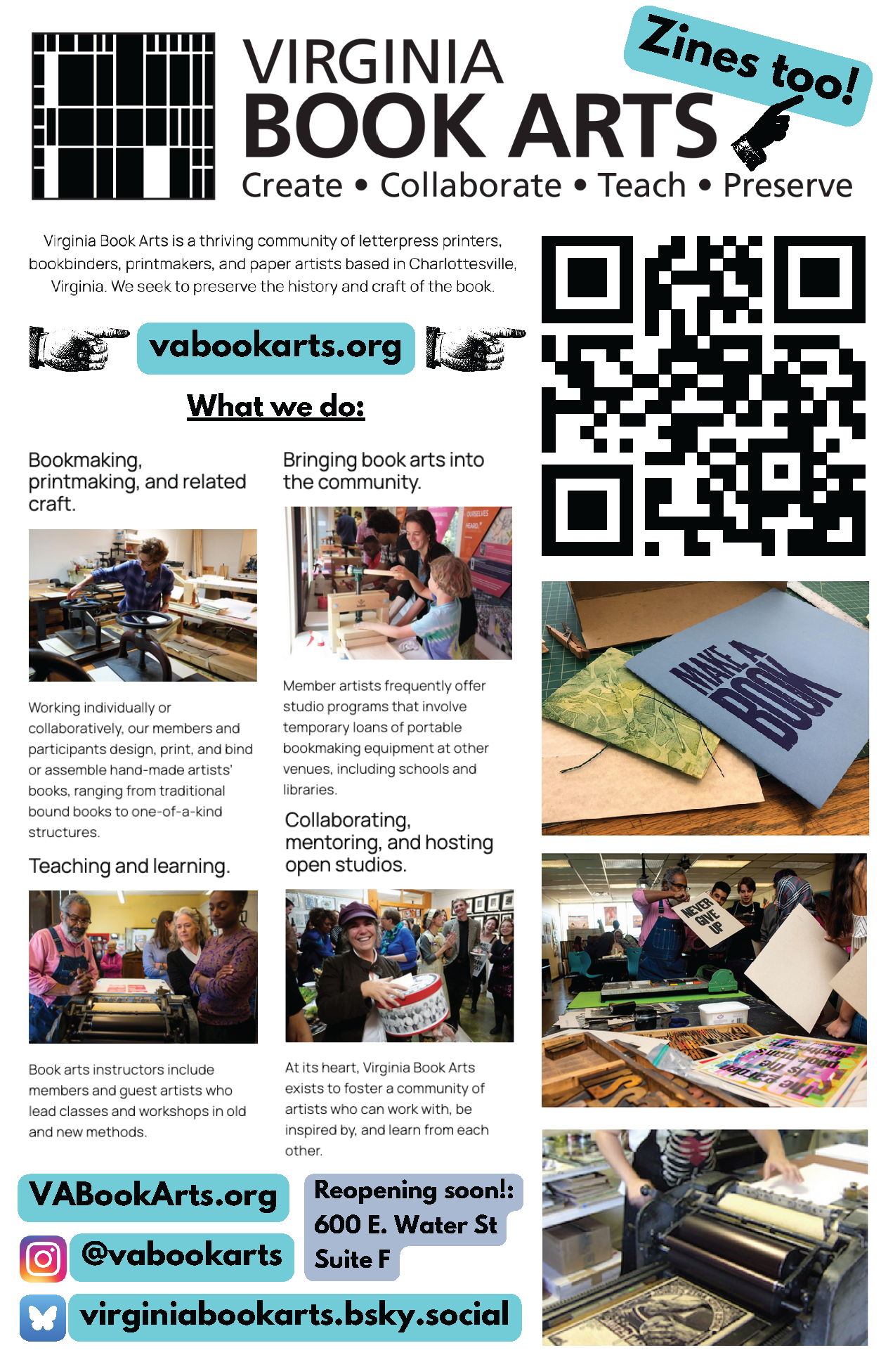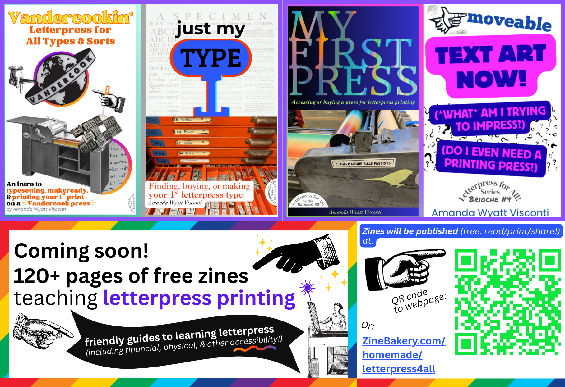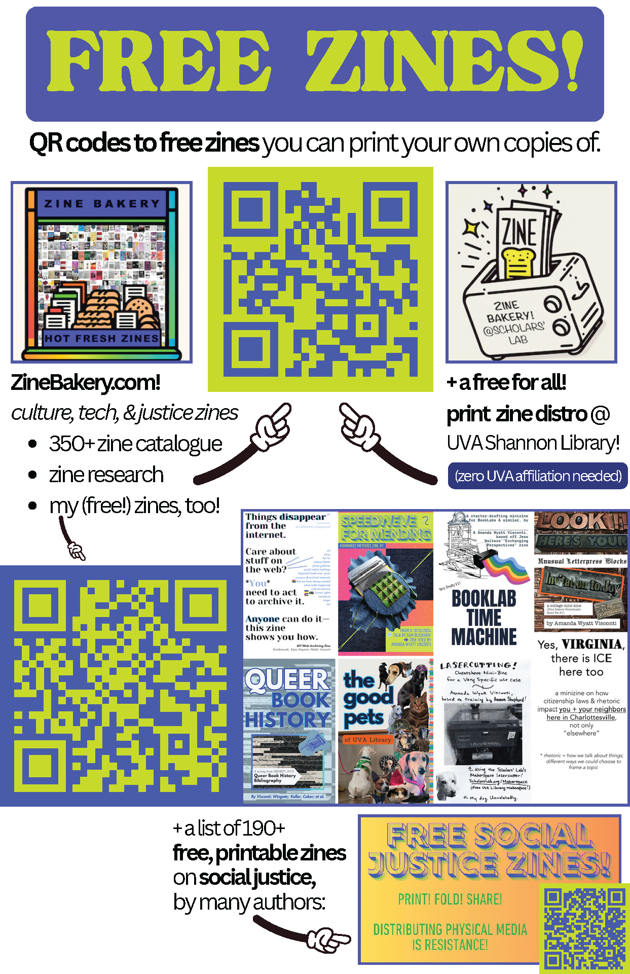 I’m tabling at the third annual Charlottesville Zine Fest this Saturday, October 18th, sharing free print zines and representing both UVA Library and Virginia Book Arts. Here are some of the graphics I made for my table, which will have a shimmery rainbow tablecloth (of course).