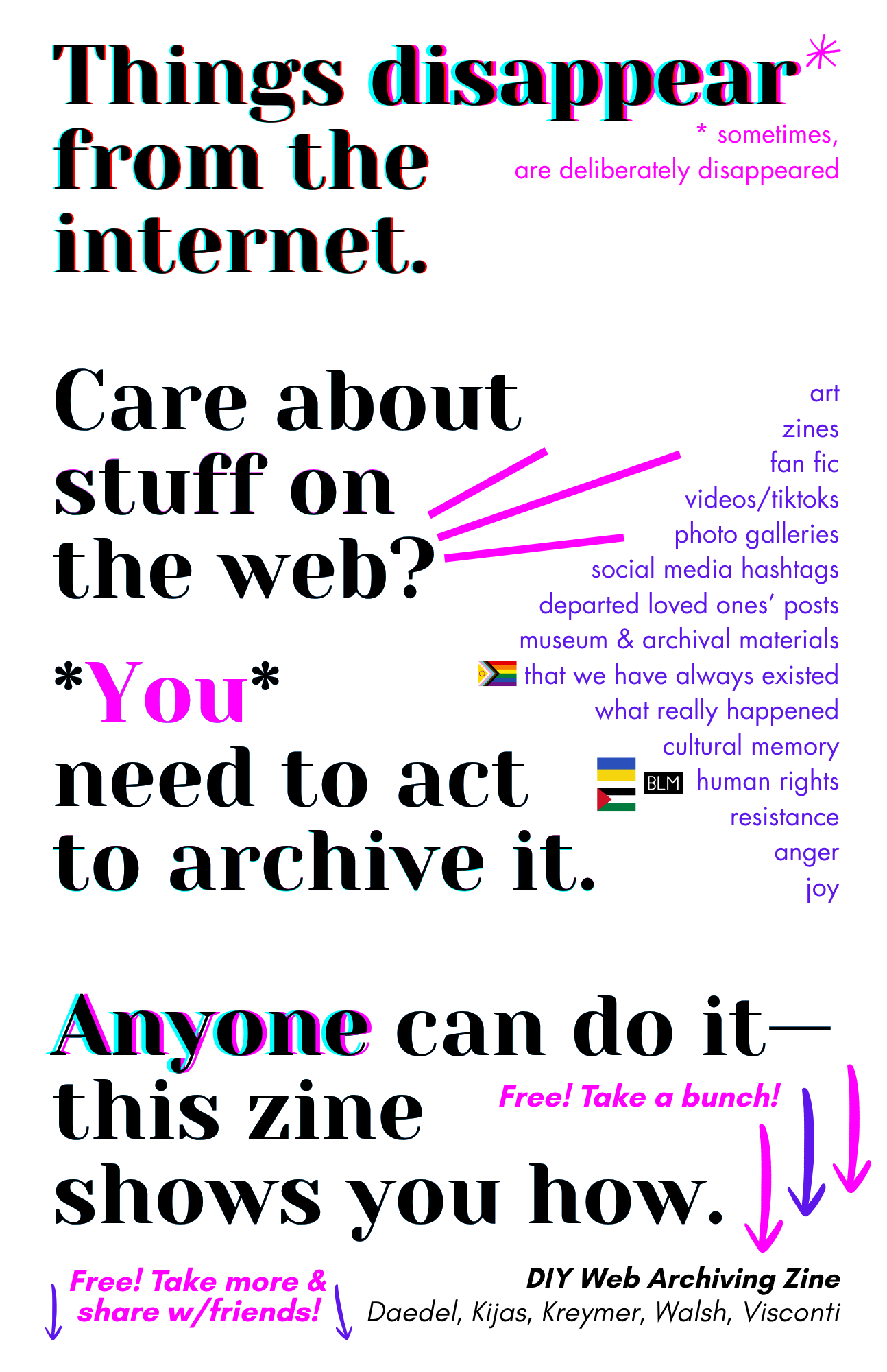 DIY Web Archiving shows you why everyone should participate in preserving the things on the web they care about, and how anyone can do so (no special expertise required!). Based on the 11/25/2024 virtual workshop co-sponsored by WebRecorder, SUCHO, and ACH; taught by Walsh, Kreymer, Daedel, & Kijas; with additional text/resources from & zineified by Amanda Wyatt Visconti.